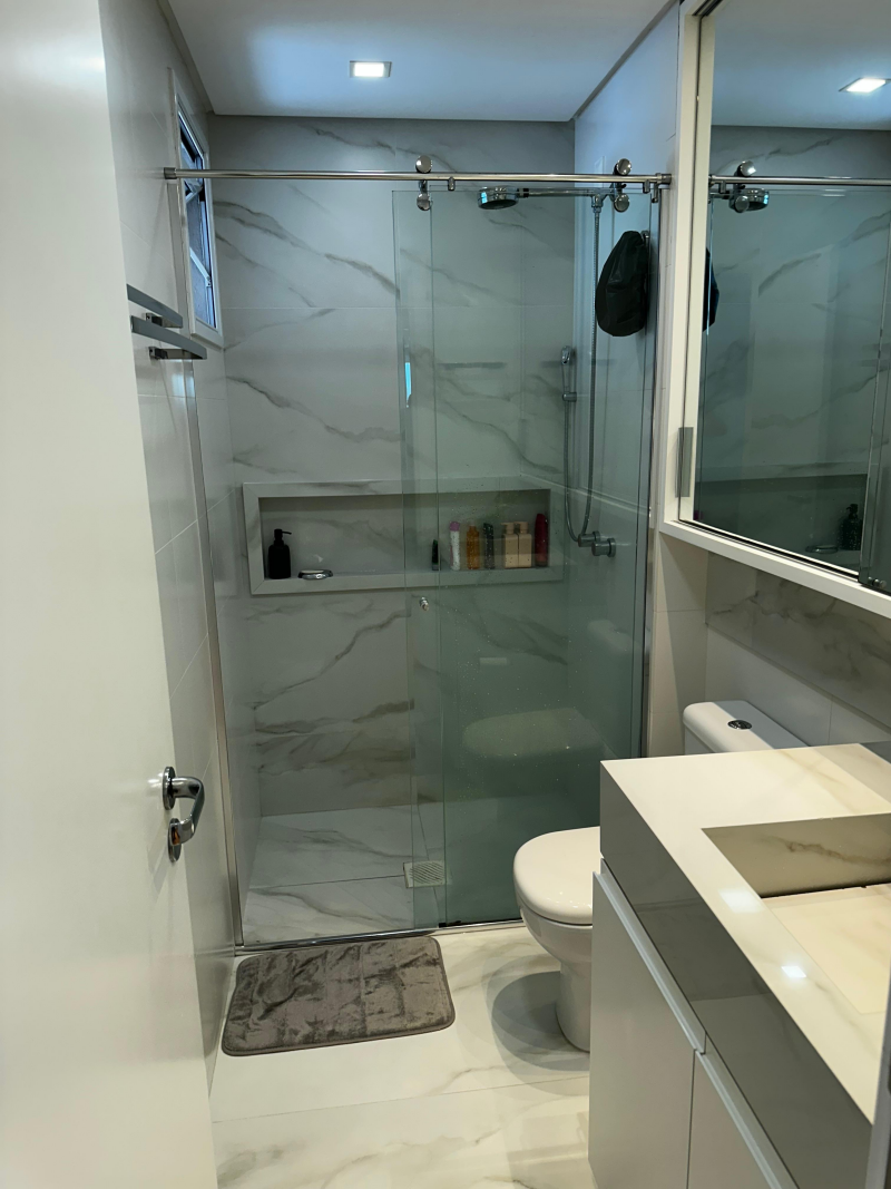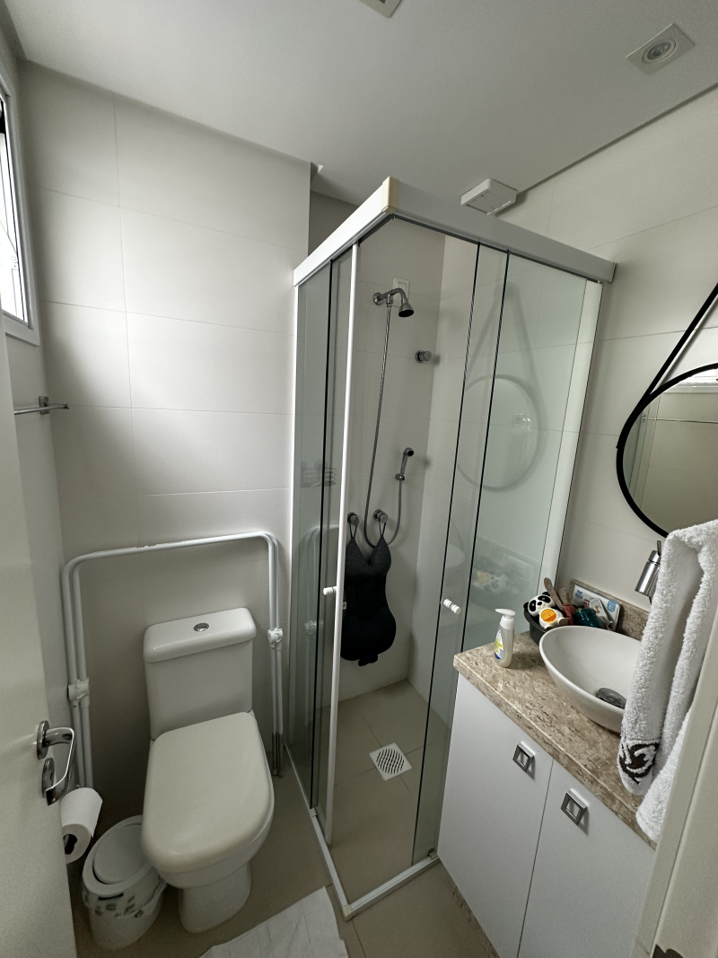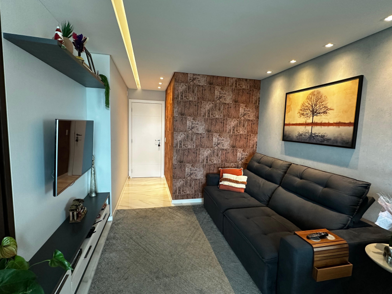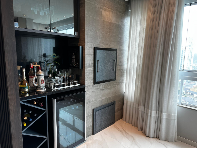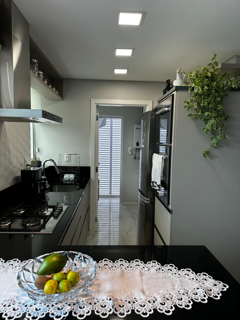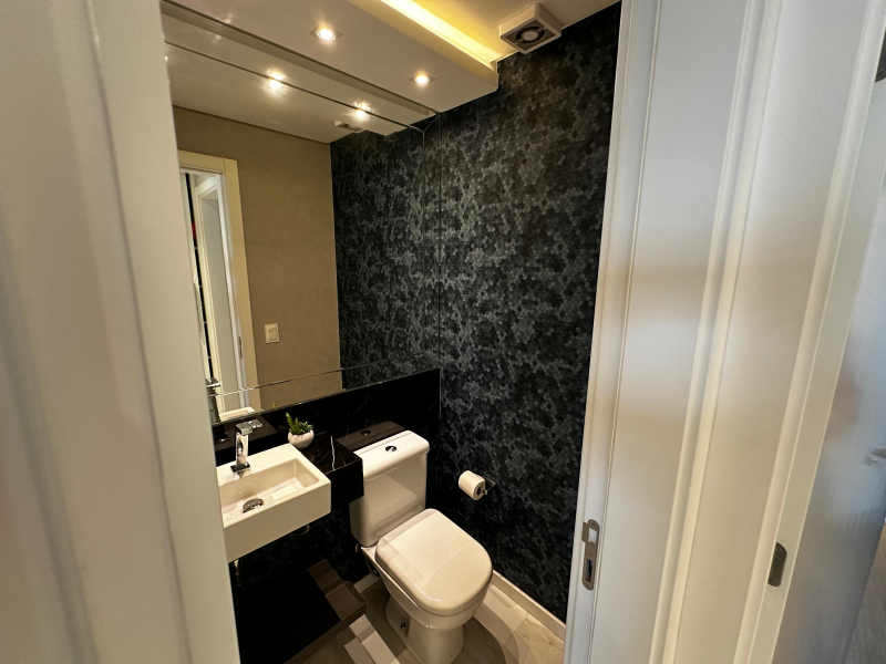 Este imóvel conta com sala com sacada integrada - com churrasqueira, cozinha, área de serviço, 2 suítes, lavabo, e 2 vagas de garagem individuais.