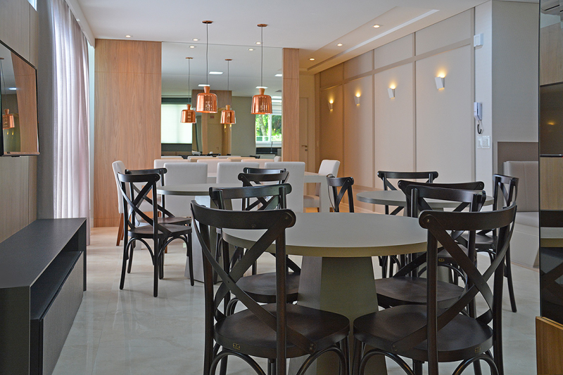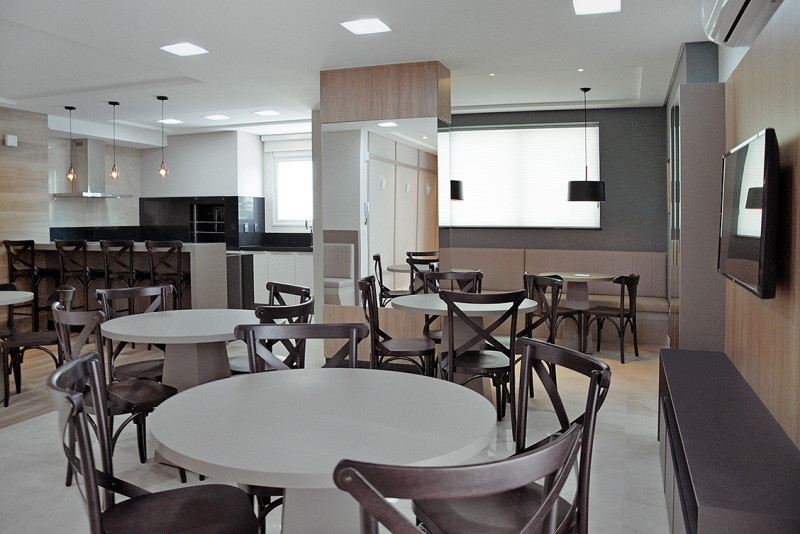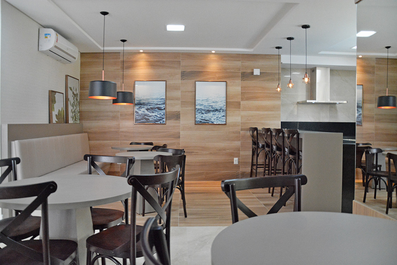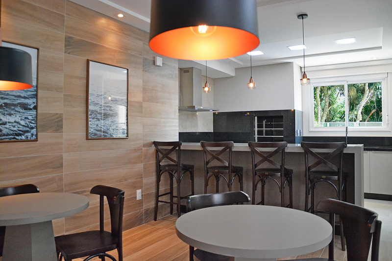 - Salão de festas decorado e mobiliado, com churrasqueira